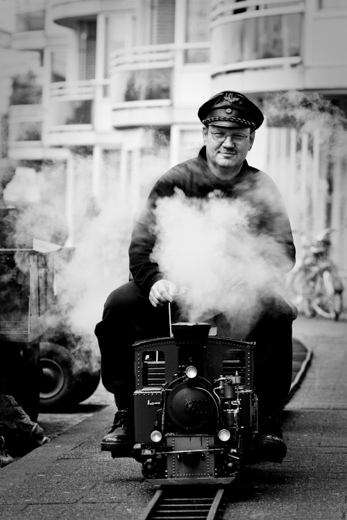 Deze foto is naar zwart-wit omgezet in Lightroom met behulp van de B&W – High Contrast Preset die er standaard in zit. De curve is aangepast om de schaduwen donkerder te maken en de lichte delen iets lichter. Met highlight recovery en een vignette is de lichte achtergrond van de flats in de achtergrond donkerder gemaakt, de machinist heeft een beetje fill-light gekregen om de donkere delen iets lichter te maken en ter compensatie is het algehele contrast aangepast. Er zijn geen lokale aanpassingen gedaan, die functie gebruik ik eigenlijk alleen bij grote problemen in een foto.