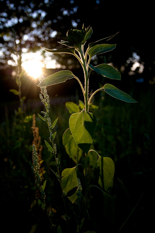 De beste manier was spelen met tegenlicht, om zowel de zon als de bloem in beeld te brengen. De lichtval op de plant zorgt er voor dat hij duidelijk afsteekt tegen de relatief donkere omgeving.