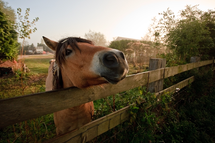 Na de flora ook aandacht voor de fauna. Dit paard stond hele stukken van bomen en struiken af te trekken. Heel even werd hij echter afgeleid door een fotograaf en wilde graag geaaid worden.