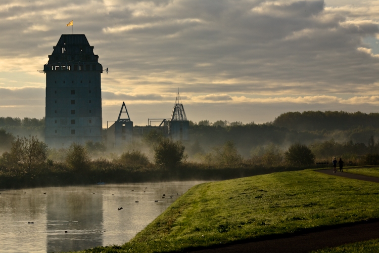 Rond half tien begon het licht steeds feller te worden, maar de mist begon ook wat sterker op te trekken. Door met 2/3 onder te belichten werd de mist goed zichtbaar. De twee dames rechts onderin kwamen voorbij de plek waar ik stond rennen, ik heb expres even gewacht zodat ik ze in het beeld kon opnemen om de grootte van het half-afgebouwde gebouw te tonen.