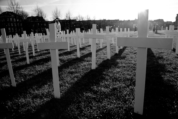 Nog een foto van het Museumplein op Wereld Aids Dag. Hier zie je een beetje mijn bedoeling, de kruizen in tegenlicht. Helaas haalden ze ze vlak hierna weg…