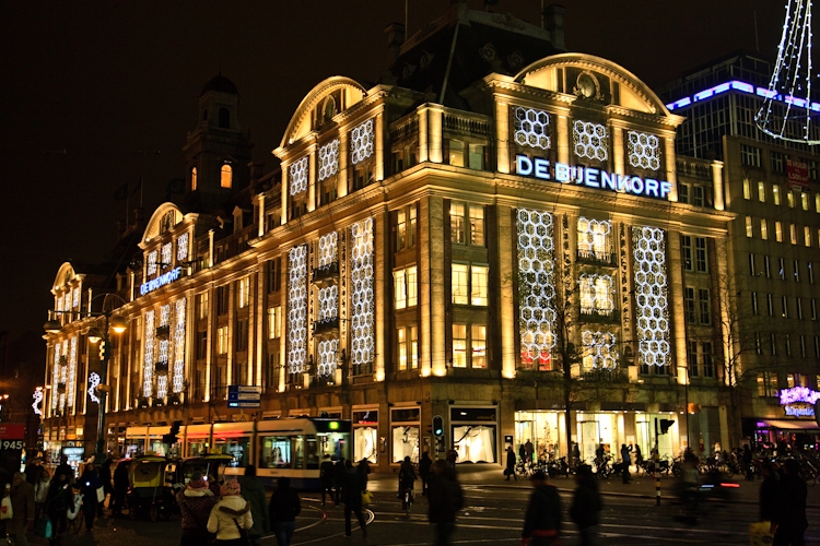 LED verlichting is populair dit jaar, al dan niet vanwege milieu overwegingen, maar zeker kosten overwegeingen. Niet overal is het even geslaagd, LED licht kan soms koud overkomen. Bij de Bijenkorf hebben ze het groots aangepakt met 106 duizend lampjes die ook nog eens geanimeerd zijn en honingraat patronen vormen.