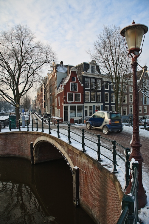 Een echt Amsterdams plaatje. De grachtenpanden (let op de ooievaar op de hoek van het rode pand), de gracht en de aparte lantaarnpalen in één beeld gevangen.