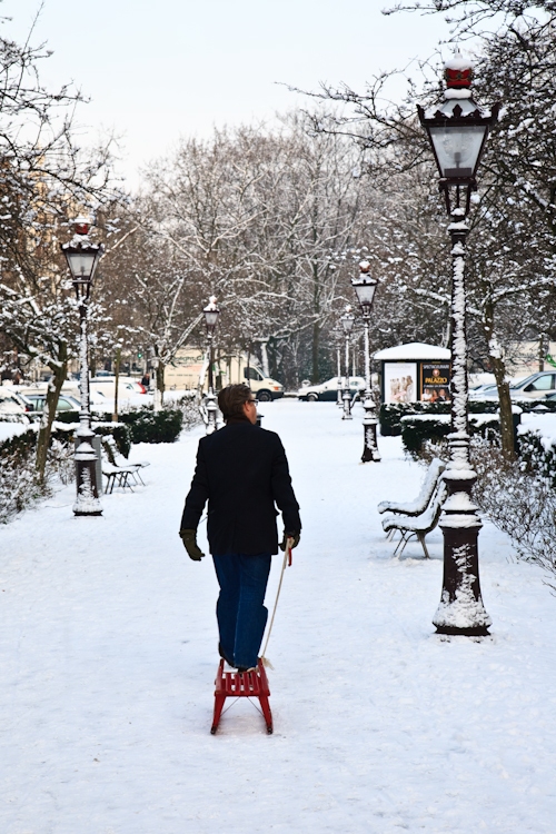 In deze foto heb ik geprobeerd dieptewerking te krijgen door de lantaarnpalen het oog het beeld in de laten leiden. Zonder een aandachtstrekker is het beeld echter lang niet zo interessant, gelukkig liep deze voorbijganger net met een slee het beeld in. Zou hij trouwens iemand vergeten zijn?