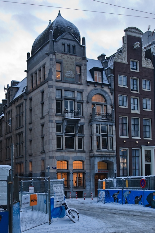 De dooi heeft redelijk ingezet, langzaam verdwijnt het witte tapijt. Dit gebouw van de voormalige Marin Insurance Company Limited aan het Rokin heb ik al eens eerder gefotografeerd (externe link naar Flickr), maar de sneeuw geeft er weer een hele andere sfeer aan. De blauwe borden met bukkende mensen zijn er om de bouwput van het nieuwe metrostation aan de aandacht te onttrekken. Finishing touch is wat mij betreft de met sneeuw bedekte fiets.