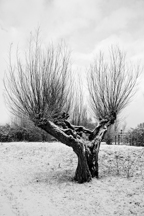 Nog een beeld van eerder deze maand, toen de wereld nog wit was. Een oude wilg in Nationaal Park de Hollandse Biesbosch. Ik heb er voor gekozen dit beeld naar zwart-wit om te zetten, er waren toch al weinig kleuren en de lucht was vrij saai. Daarnaast brengt de zwart-wit bewerking de vorm van de boom nog nadrukkelijker naar voren.