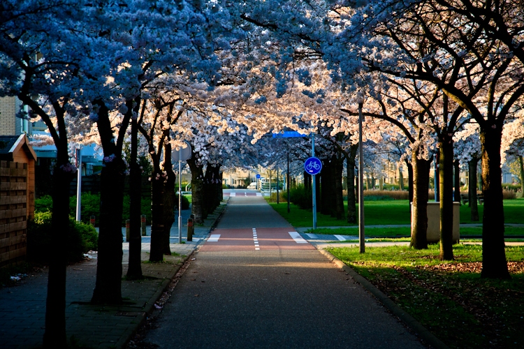 Rond 7 uur ging ik op weg naar station Almere Muziekwijk, waar ik ongeveer 15 a 20 minuten de tijd had om de bloesem in de zon te fotograferen voordat de lucht helemaal dicht trok met grijze wolken.