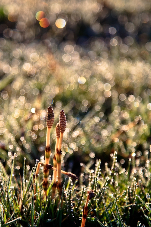 Een misschien wat extreme toepassing van bokeh in de achtergrond, misschien wel het eigenlijke onderwerp in plaats van de vreemd uitziende paddestoeltjes (denk ik) die overal opduiken in Almere. Het had die nacht een beetje gevroren, maar de zon maakte er al vroeg druppels van die fantastisch werden verlicht door de ochtendzon.