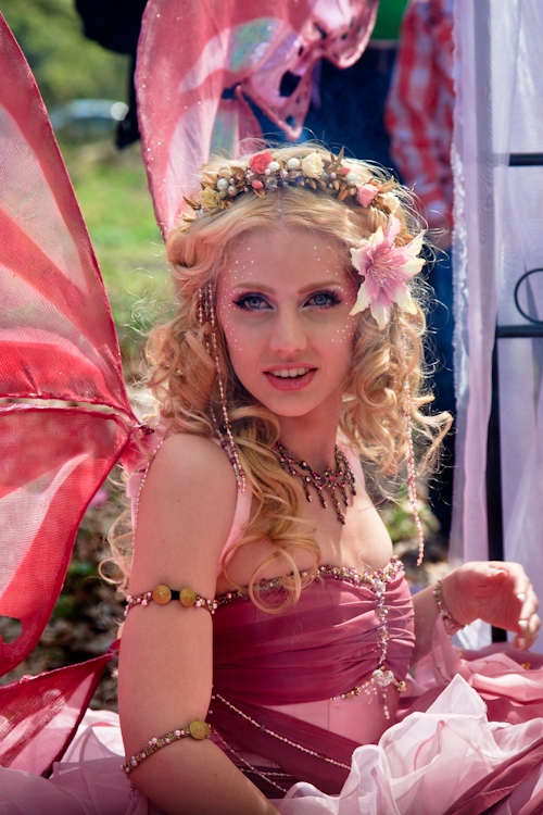 Deze dame trok behoorlijk wat aandacht, zitten in een tent voor een High Tea met mede-Elfen. Ondanks het middaguur (13.00u) was heel licht toch zacht dankzij de tent. Sowieso is het landgoed rijkelijk voorzien van bomen zodat er op veel plekken schaduw was te vinden, waardoor het contrast bij portretten beter was te reguleren.